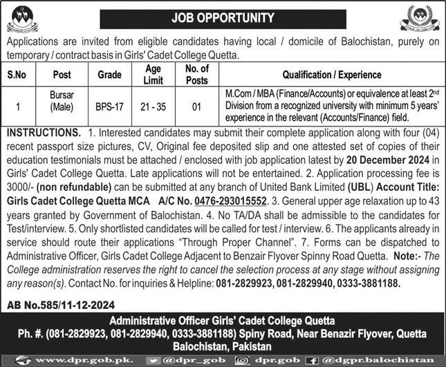 Girls Cadet College Quetta, quetta Balochistan Pakistan invites applications from eligible candidates for the post of bursar as per advertisement of December 12, 2024 published in daily Express Newspaper. M.com, Master and MBA etc. educational qualification will be preferred.