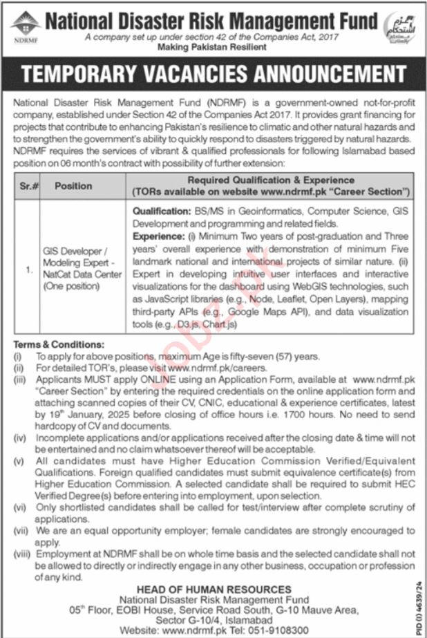 National Disaster Management Authority invites applications for job positions advertised in daily Jang dated 12 January 2025 for following vacancies in Islamabad, islamabad Islamabad Pakistan.