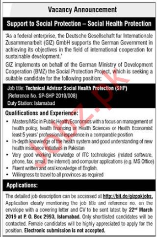 Vacancies in GIZ Pakistan Advertisement March 2019