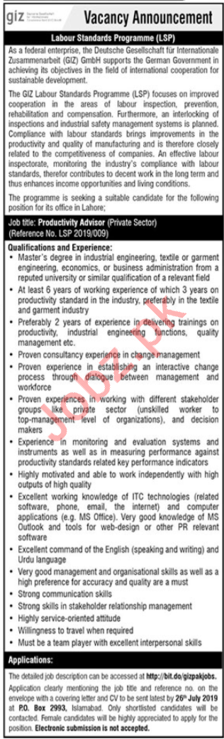 Vacancies in GIZ Pakistan Advertisement July 2019