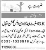 Real Estate Company jobs advertisement dated about 1 May 2024 in daily Express Newspaper invites application for the vacant post of secretary and personal secretary in Karachi, karachi Sindh Pakistan. Preferred Education is Bachelor, BA and Intermediate etc.