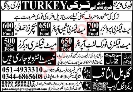 Vacant posts including mate factory machine operator, butcher, mate factory fork lift operator, mate factory supervisor and mate factory worker are announced in Global Al Saqib Recruitment Group Istanbul, istanbul Turkey as per 23 December 2024 advertisement in daily Express Newspaper. Preferred Education is Middle, Intermediate, Matric and Primary etc.
