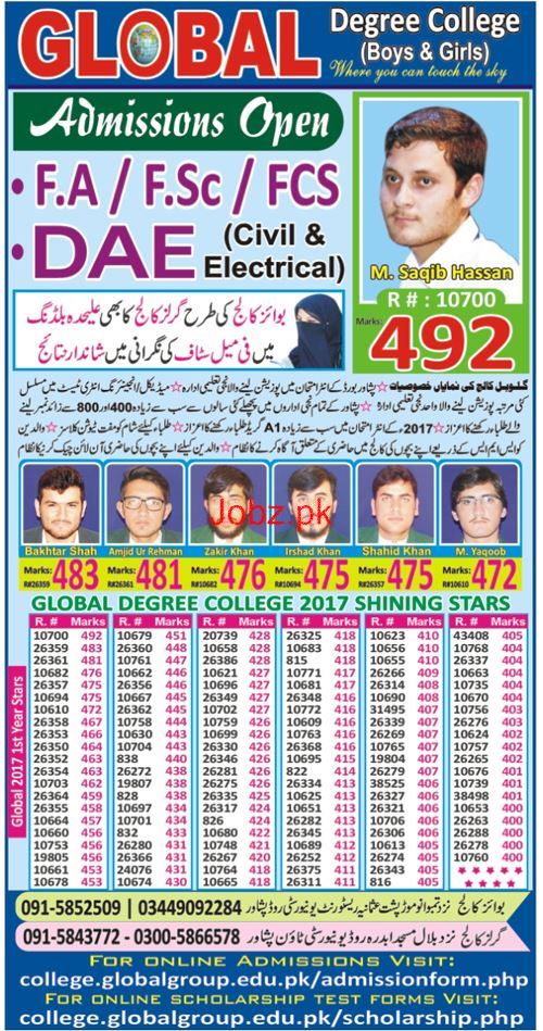 Global Degree College for Boys & Girls Admission in FA Humanities Group, FSc Pre Medical, Pre Engineering , FCS Computer Sciences and DAE in Civil and Electrical Technology in Peshawar. Read newspaper ad for exact details.