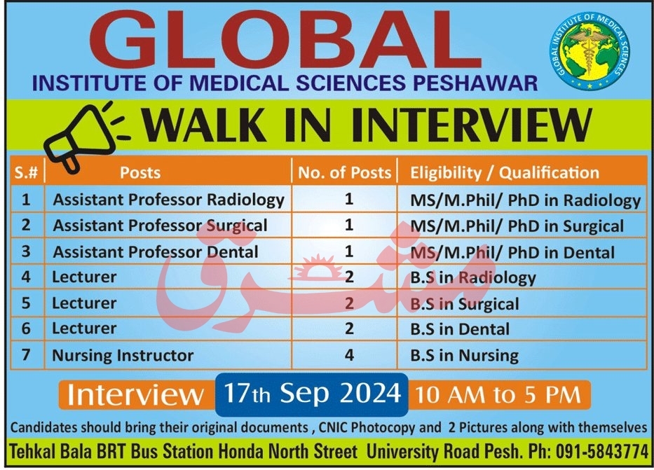 Global Institute of Medical and Health Sciences GIMHS is looking for candidates for following posts as per job advertisement published in daily Mashriq Newspaper of September 17, 2024 for location Peshawar, peshawar Khyber Pakhtunkhwa KPK Pakistan: