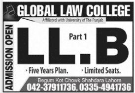 Global Law College affiliated with University of The Punjab invites applications for online admissions in Bachelors of Laws LLB 5 Years Program in Lahore Punjab 2020. Read newspaper ad for exact details.