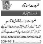 Global Link Communication Islamabad, islamabad Islamabad Pakistan invites applications from eligible candidates for the post of qaria, teacher, qari and quran teacher as per advertisement of August 10, 2024 published in daily Express Newspaper. Preferred Education is Bachelor, Intermediate and BA etc.