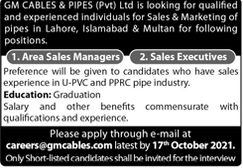 Vacancies in GM Cables & Pipes Pvt Limited Advertisement October 2021