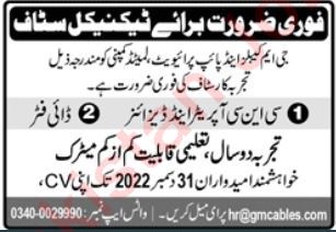 Vacancies in GM Cables & Pipes Pvt Limited Advertisement November 2022