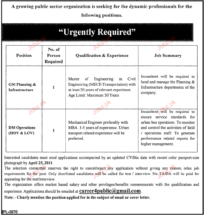 Apply as per details in job advertisement. Login to view further details of how to apply via https://www.jobz.pk online.