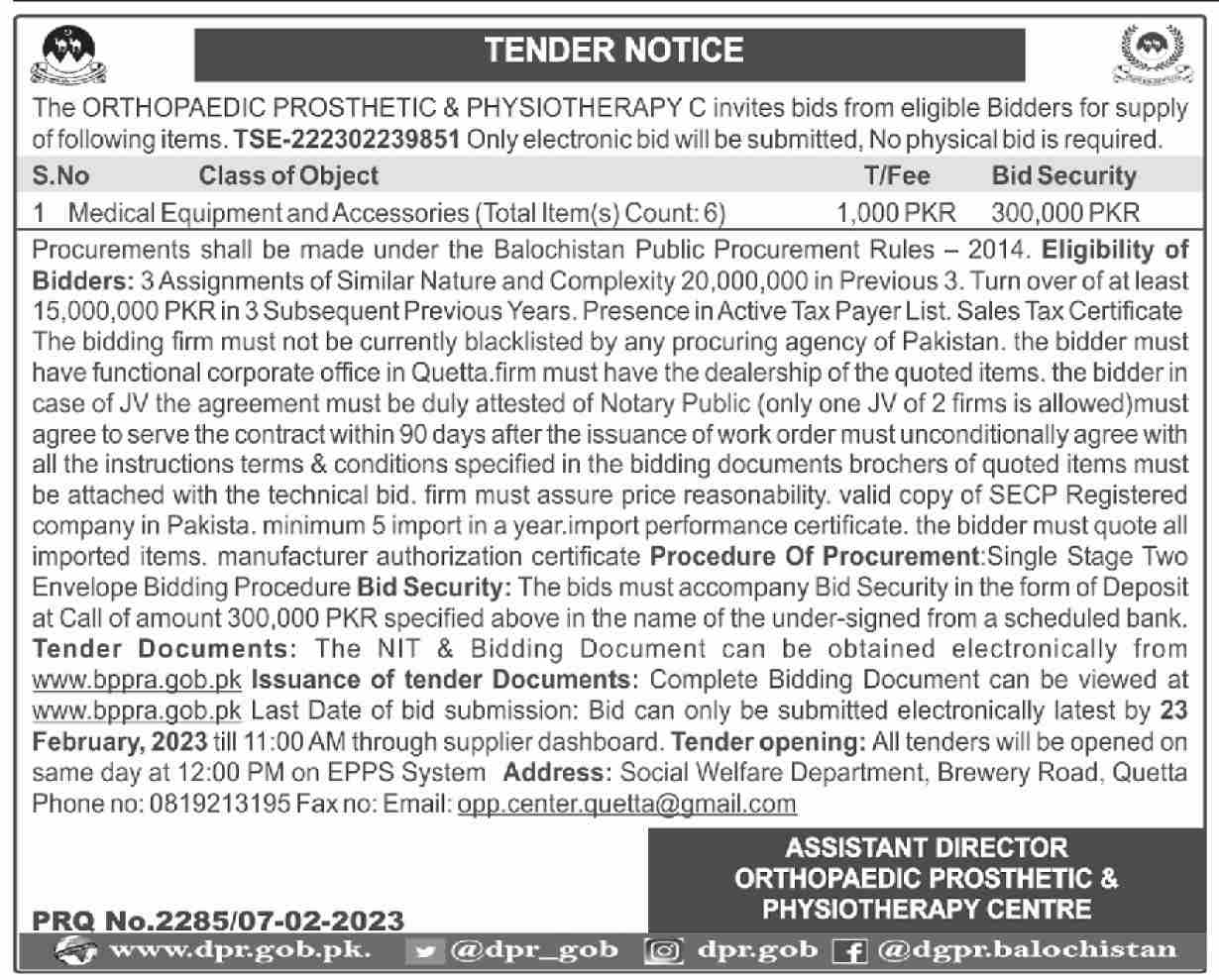 Government of Balochistan is inviting tenders for Equipments for various tasks as per Dawn newspaper advertisement of February 2023 in Quetta Balochistan Pakistan.