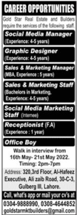 Gold Star Marketing is looking for candidates for following posts as per job advertisement published in daily Jang Newspaper of May 15, 2022 for location Lahore, lahore Punjab Pakistan: