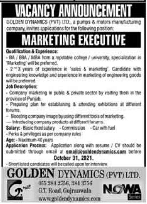 Latest Golden Dynamics Pvt Ltd Marketing Posts Gujranwala 2025