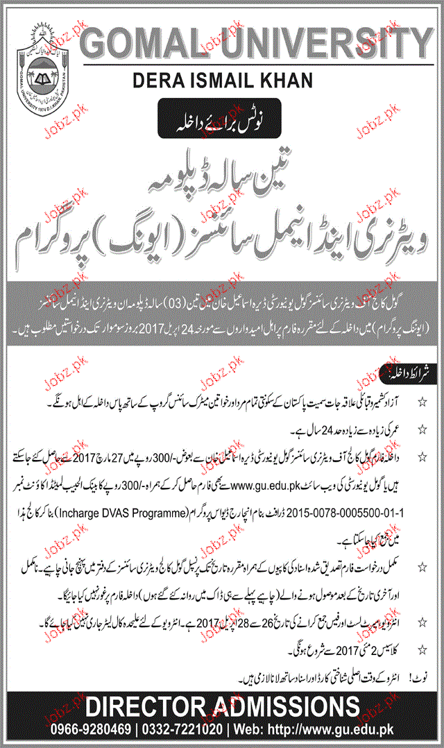 Gomal University Admission in Diploma in D I Khan. Read newspaper ad for exact details.