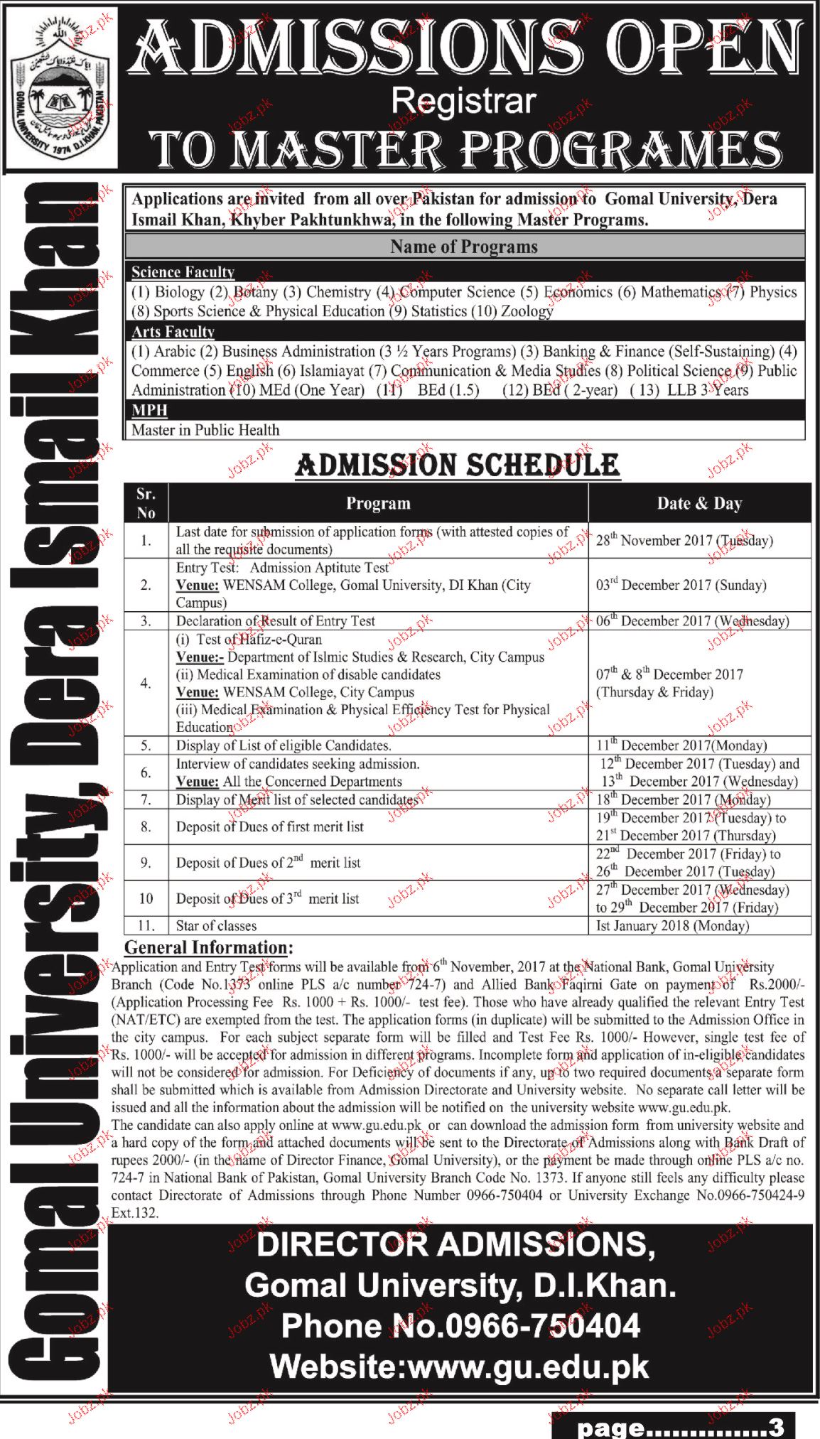 Gomal University Admission in Master Programs in D I Khan. Last date for submission of admission forms is 28 December 2017. Display of List Eligible Candidate 11 December 2017. Read newspaper ad for exact details.