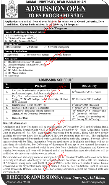 Gomal University Dear Ismail Khan Admission in BS in Animal Sciences, BS Poultry Science, BS Management, BS Economics and B.Ed Hon Elementary Dear Ismile Khan. Read newspaper ad for exact details.