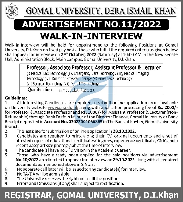 Gomal University invites applications for job positions advertised in daily Aaj dated 26 October 2022 for following vacancies in Dera Ismail Khan, dera ismail khan Khyber Pakhtunkhwa KPK Pakistan.