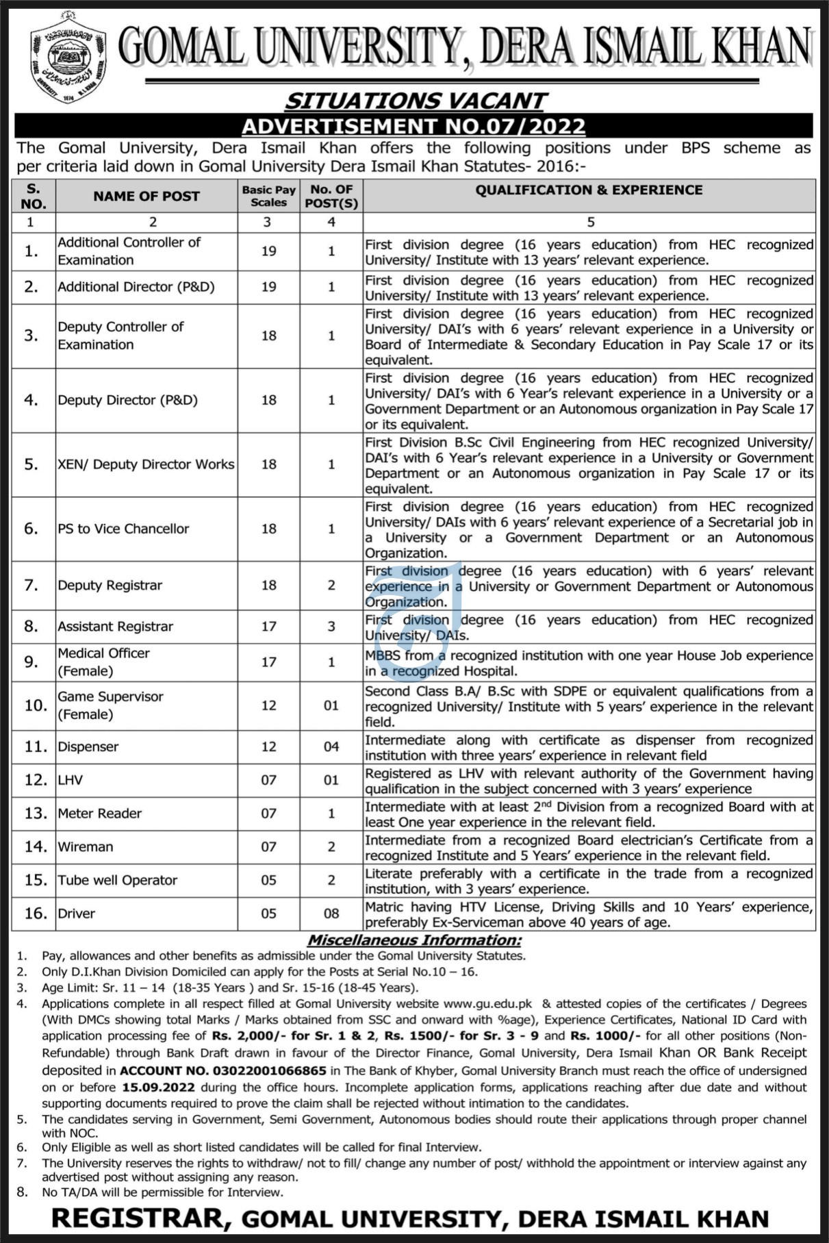 Gomal University invites applications for job positions advertised in daily Aaj dated 31 August 2022 for following vacancies in Dera Ismail Khan, dera ismail khan Khyber Pakhtunkhwa KPK Pakistan.