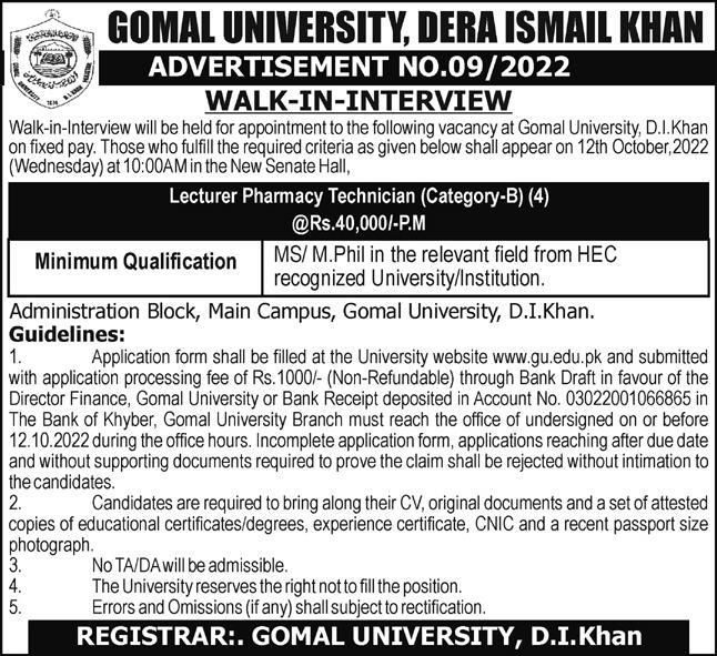 Gomal University jobs advertisement dated about 3 October 2022 in daily Express Newspaper invites application for the vacant post of lecturer pharmacy technician, lecturer and lecturer catagory b in Dera Ismail Khan, dera ismail khan Khyber Pakhtunkhwa KPK Pakistan. Persons with Mphil and MS etc. education can apply.