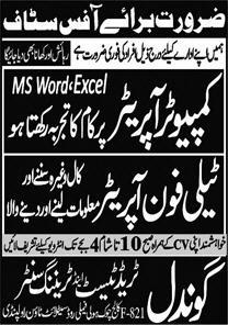 Gondal Trade Test & Training Center Rawalpindi, rawalpindi Punjab Pakistan invites applications from eligible candidates for the post of computer operator and telephone operator as per advertisement of September 9, 2022 published in daily Express Newspaper. Candidates with Bachelor and Intermediate etc. educational background will be preferred.