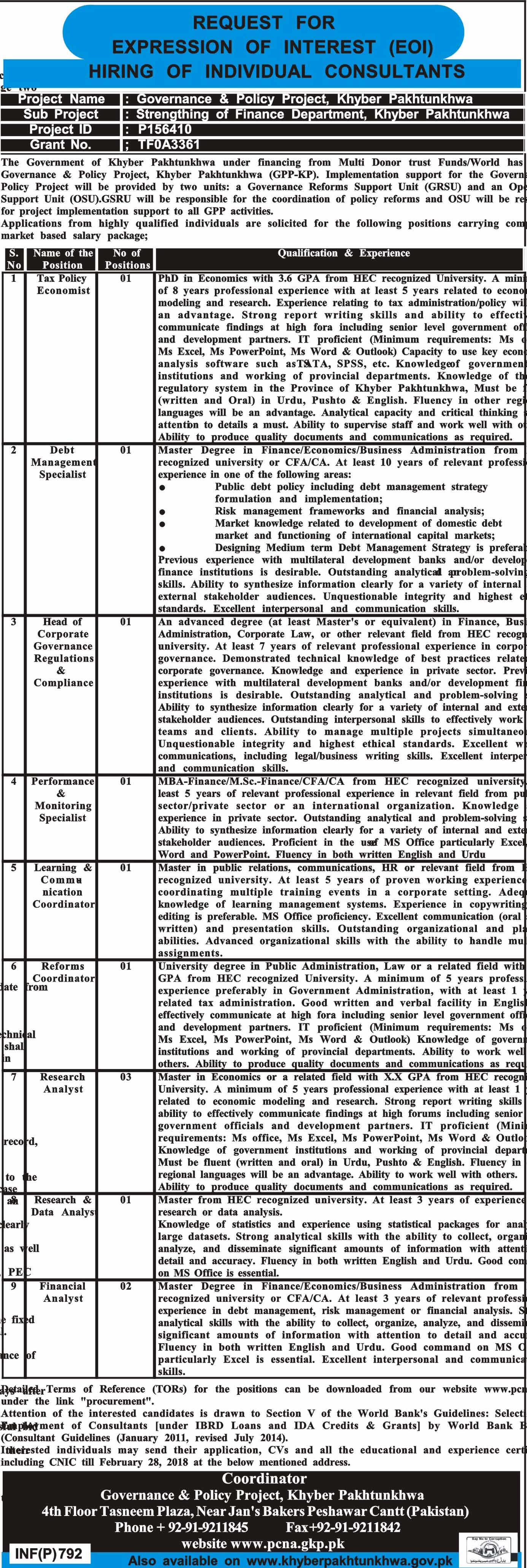 Tax Policy Economist having Phd in Economics, Debt Managemetn Specialists, Master Degree MA / MSc in Finance / Business Administration, Head of Corporate Governance Regulations & Compliance, Performance & Monitoring Specialsis adn Learnign & Communication Coordinators are required in Governance and Policy Project, Strength of Finance Department KPK in Peshawar.