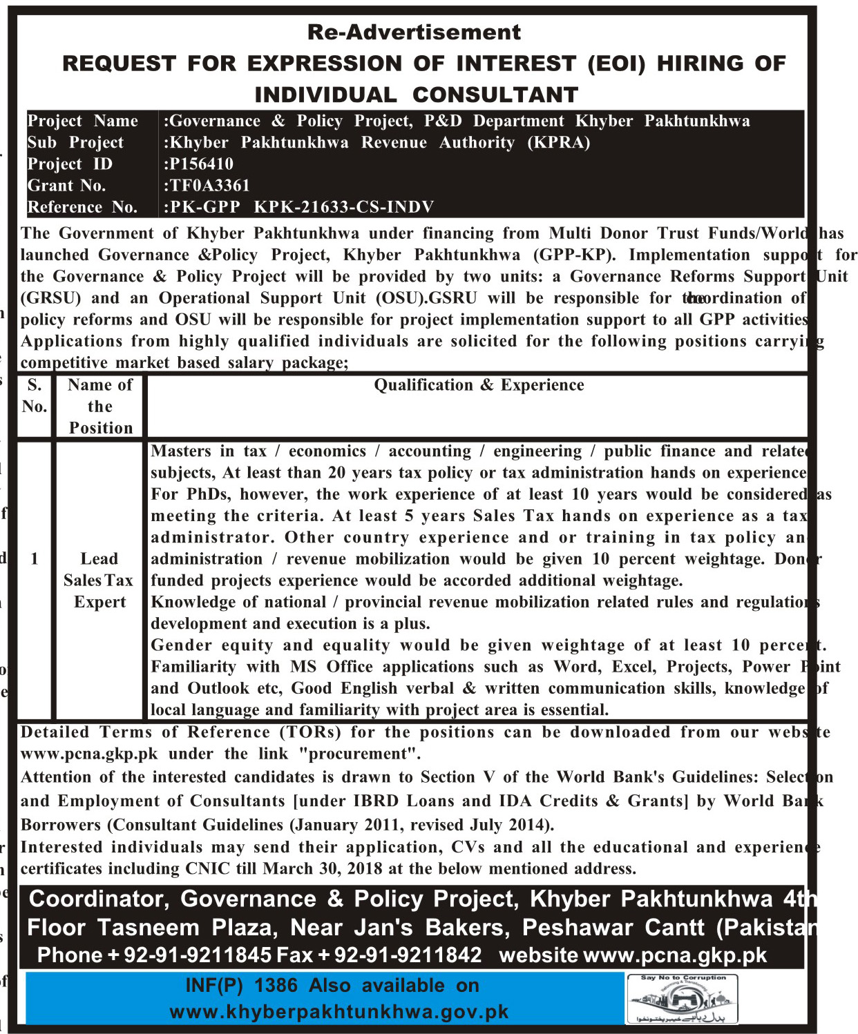 Latest Governance and Policy Project Consultant Posts Peshawar 2025