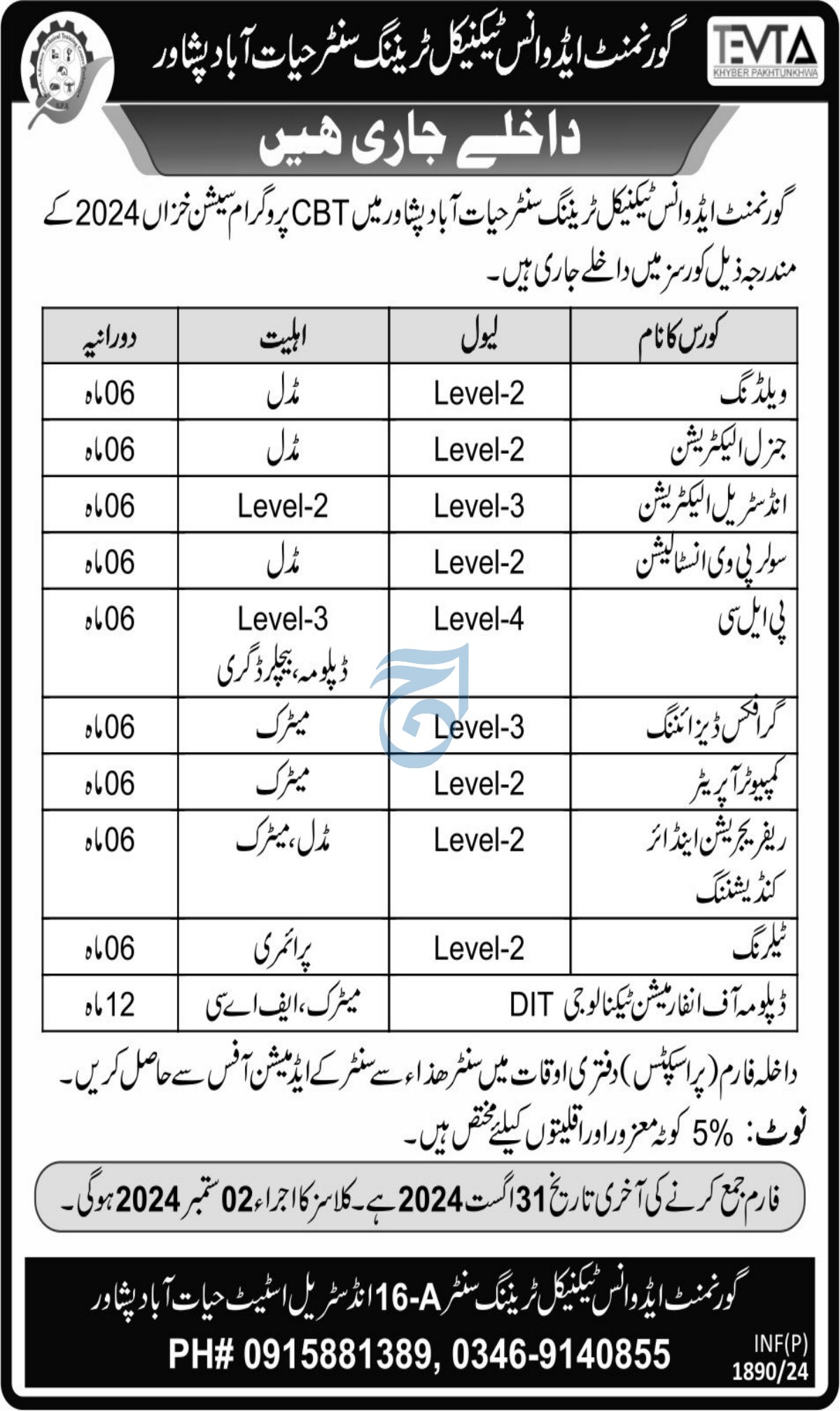 Admissions in Government Advance Technical Training Center 2024 for Welding, General Electrician, Industrial Electrician, Solar PV Installation, PLC has been announced. Eligible students who qualify as per admission criteria in Government Advance Technical Training Center Peshawar Khyber Pakhtunkhwa KPK Pakistan can apply in Technical Course for academic year 2024. Students who want to enroll for academic session 2024 in Diploma and Course qualification and admission criteria for Government institute can apply till last date 31 August 2024. Read newspaper ad for exact details.