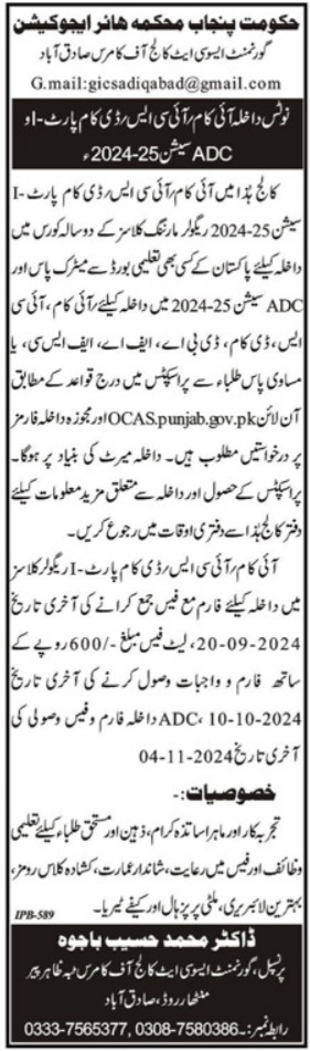 Government Associate College of Commerce I Com, ICS, D Com Part 1 admissions 2024 has been announced. Students can enroll for admissions in Government Associate College of Commerce Sadiqabad Punjab Pakistan for academic year 2024 to continue campus based or online education in Management College. Eligible candidates for admissions in Intermediate, ICS and I.com can apply as per Government institute criteria and before closing date 20 September 2024 after reading advertisement online. Read newspaper ad for exact details.