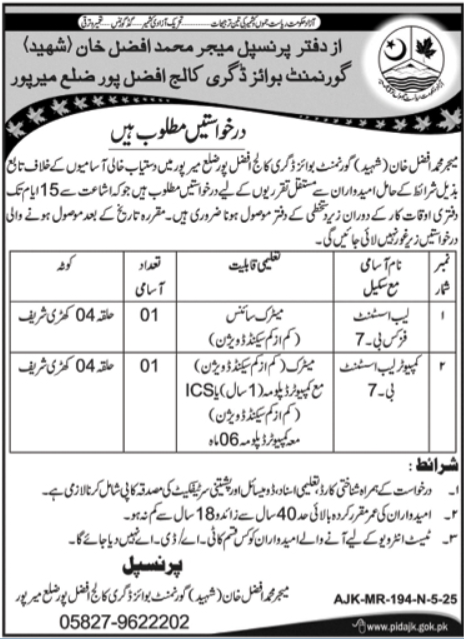 Government Boys Degree College invites applications for job positions advertised in daily Ausaf dated 2 June 2025 for following vacancies in Mirpur, mirpur AJK Pakistan.