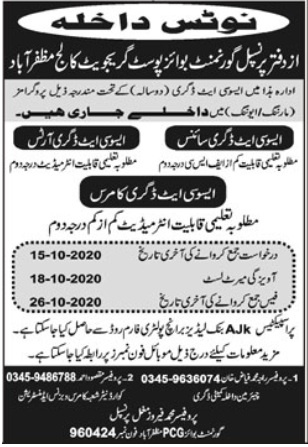 Government Boys Postgraduate College is offering admissions in Associate Degree Science ADS, Associate Degree Arts ADA and Associate Degree Commerce ADC in Muzaffarabad AJK. Read newspaper ad for exact details.