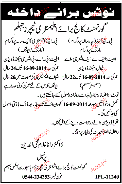 Government College For Elementary Teachers Admission in B.Ed in Jhelum. Read newspaper ad for exact details.