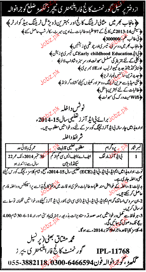 Government College For Elementary Teachers Admission in B.Ed in Gujranwala. Read newspaper ad for exact details.