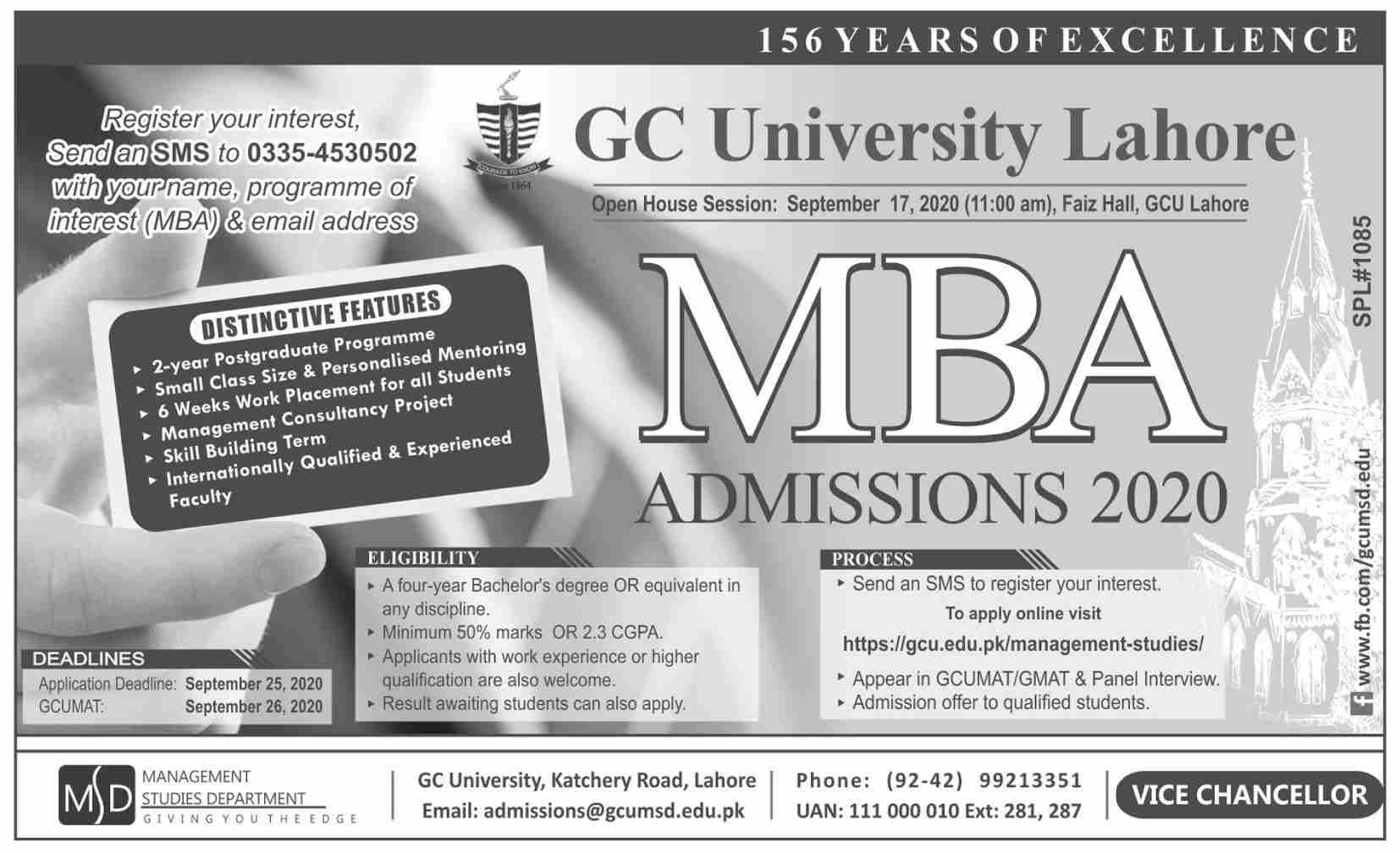 Government College GC University invited applications for admissions in Master of Business Administration MBA in Katchery Road Lahore Punjab Pakistan 2020. Read newspaper ad for exact details.