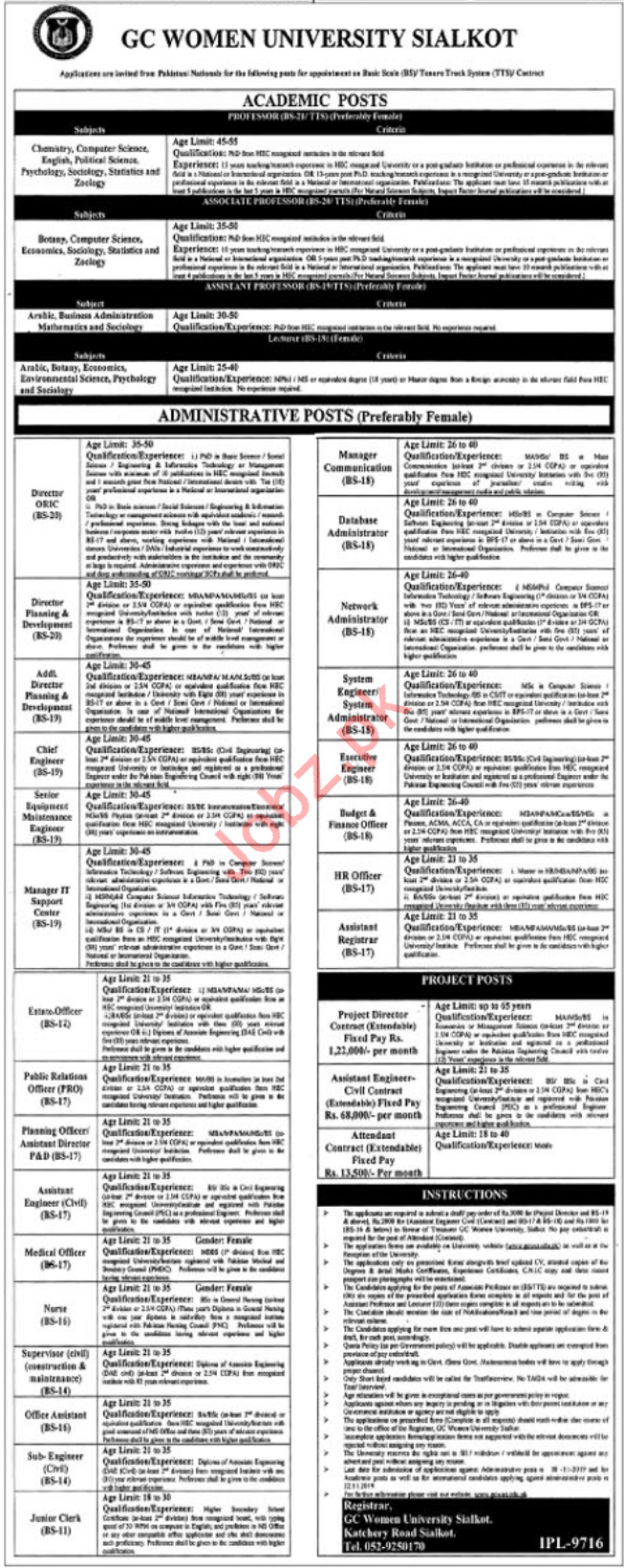 Government College GC Women University is looking for qualified, medical, health, mbbs, docto and experienced persons for the posts of Professor, Associate Professor, Assistant Professor, Lecturer, Director ORIC, Director Planning, Director Development, Manager Communication, Database Administrator, Network Administrator, Additional Director, System Engineer, System Administrator, Executive Engineer, Chief Engineer, Maintenance Engineer, Budget Officer, Finance Officer, HR Officer, Manager IT, Assistant Registrar, Estate Officer, Public Relations Officer, Project Director, Assistant Engineer Civil, Attendant, Assistant Director, Medical Officer, Nurse, Supervisor, Sub Engineer Civil and Clerk in Sialkot.