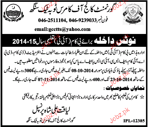 Government College of Commerce Admission in B.Com in Toba Tek Singh Read newspaper ad for exact details.