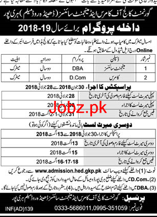 Government College of Commerce Admission in D.Com Commerce and DBA Managemetn Sciences in Haripur. Last date for submission of admission forms is 28 July 2018. Read newspaper ad for exact details.