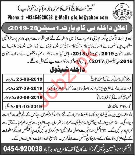 Government College of Commerce has announced admissions for Bachelor of Commerce B-Com Part 1 Session 2019 and 2020 in Jauharabad Khushab Punjab 2019. Read newspaper ad for exact details.
