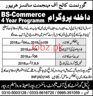 Government College of Management Sciences Hairpur Admission in BS Commerce Four Year Programm in Hairpur. Last date for submission of admission forms is 04-08- 2018. Read newspaper ad for exact details.