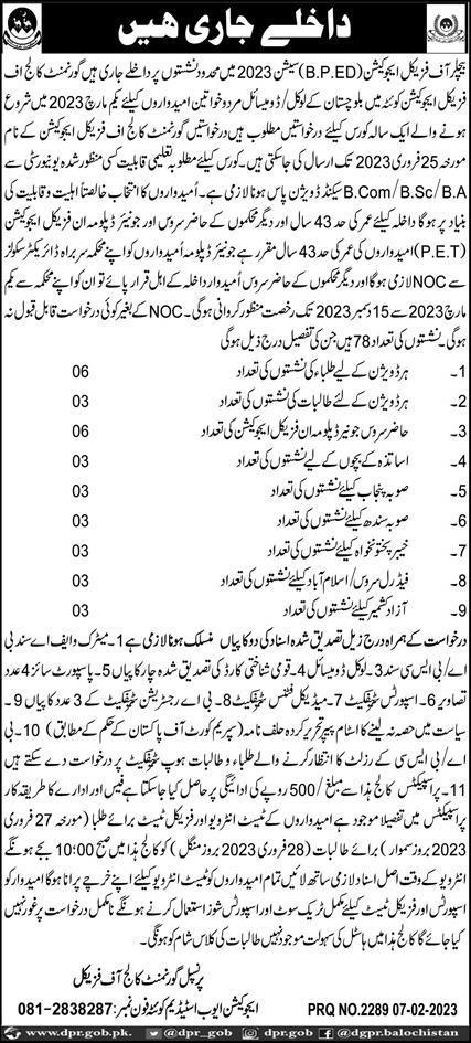 Government College of Physical Education Bachelor of Physical Education BPED admissions 2023 has been started. Students who want to take admissions in Government College of Physical Education Quetta Balochistan Pakistan for academic year 2023 to continue education in Arts College can apply. Eligible students for fulfilling criteria for admissions in Bachelor can enroll as per Government admission policy 2023 till closing date 28 February 2023. Read newspaper ad for exact details.