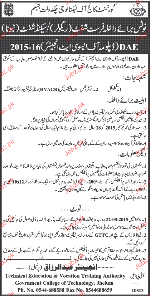 Government College of Technology Admission in DAE in Jhelum. Read newspaper ad for exact details.