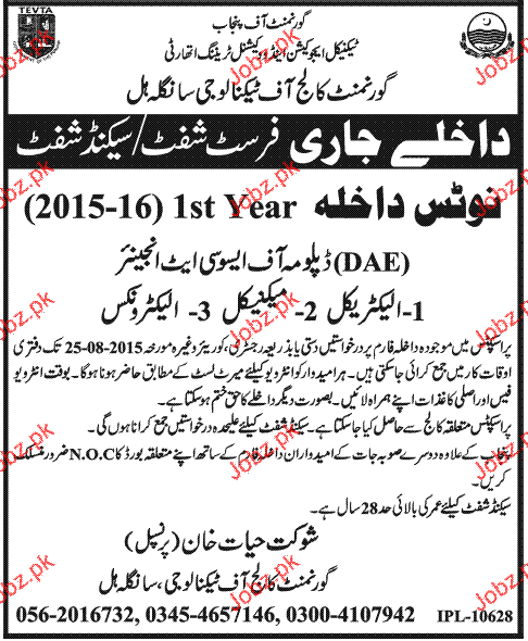 Government College of Technology Admission in DAE in Lahore. Read newspaper ad for exact details.