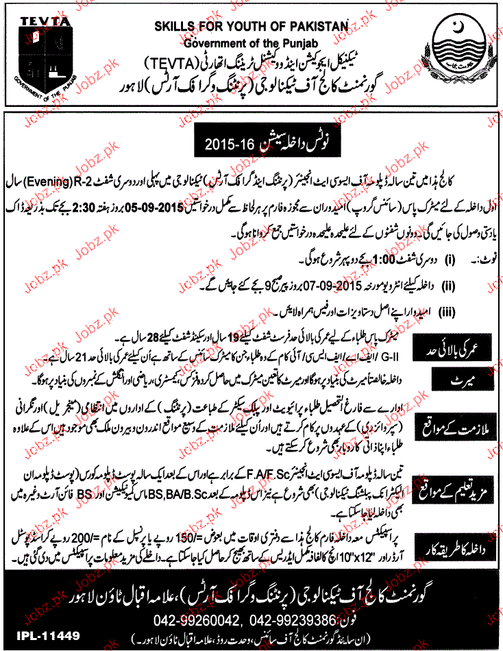 Government College of Technology Admission in DAE in Lahore. Read newspaper ad for exact details.