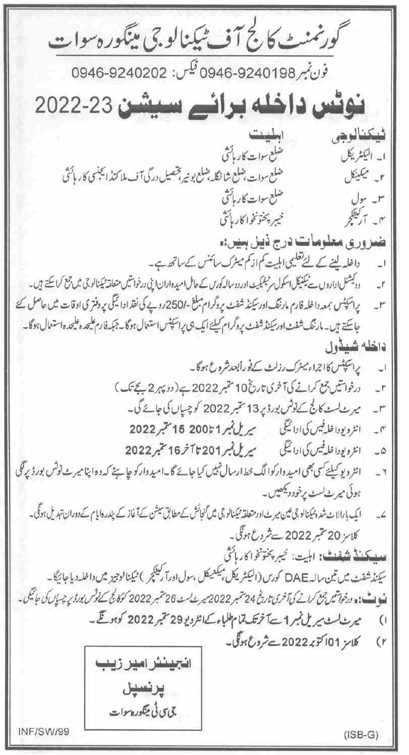 Government College of Technology Mingora Swat DAE Admission 2022 23