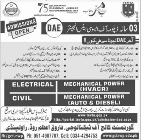 Government College of Technology has announced admissions 2022 for Diploma of Associate Engineering DAE in Electrical, Civil, Mechanical power HVACR, Mechanical Power Auto Diesel. Students can enroll for admissions in Government College of Technology Rawalpindi Punjab Pakistan for academic year 2022 to continue campus based or online education in Technical Diploma. Eligible students for fulfilling criteria for admissions in DAE can enroll as per Government admission policy 2022 till closing date 14 September 2022. Read newspaper ad for exact details.