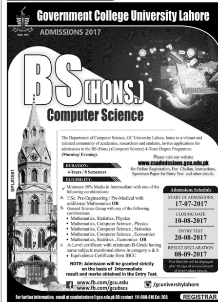 Government College University Admission in BS in Lahore. Read newspaper ad for exact details.