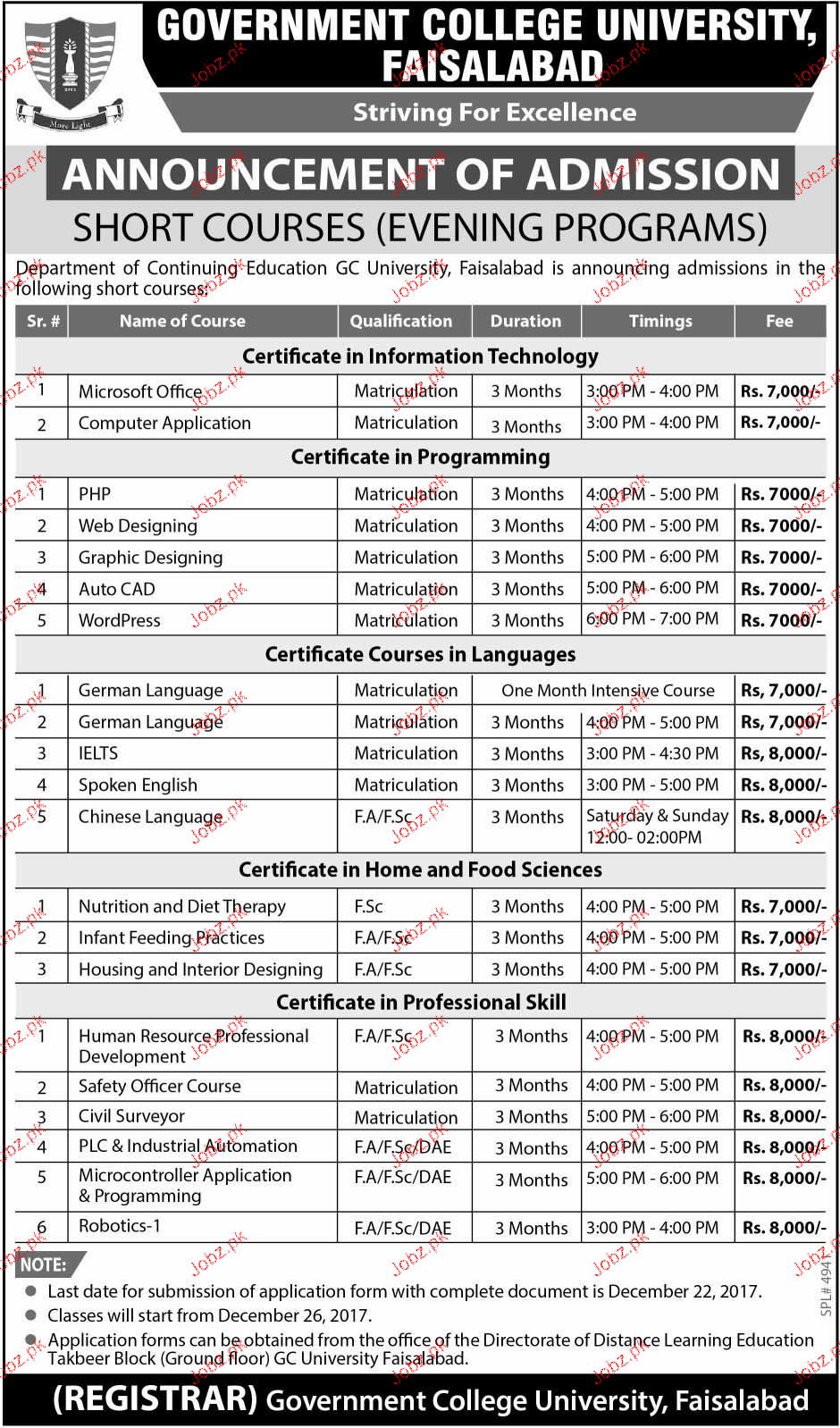 Government College University Admission in Short Courses in Microsoft Office, Computer Application, PHP, Web Designing, Graphic Designing and Wordpress in Faisalabad. Read newspaper ad for exact details.