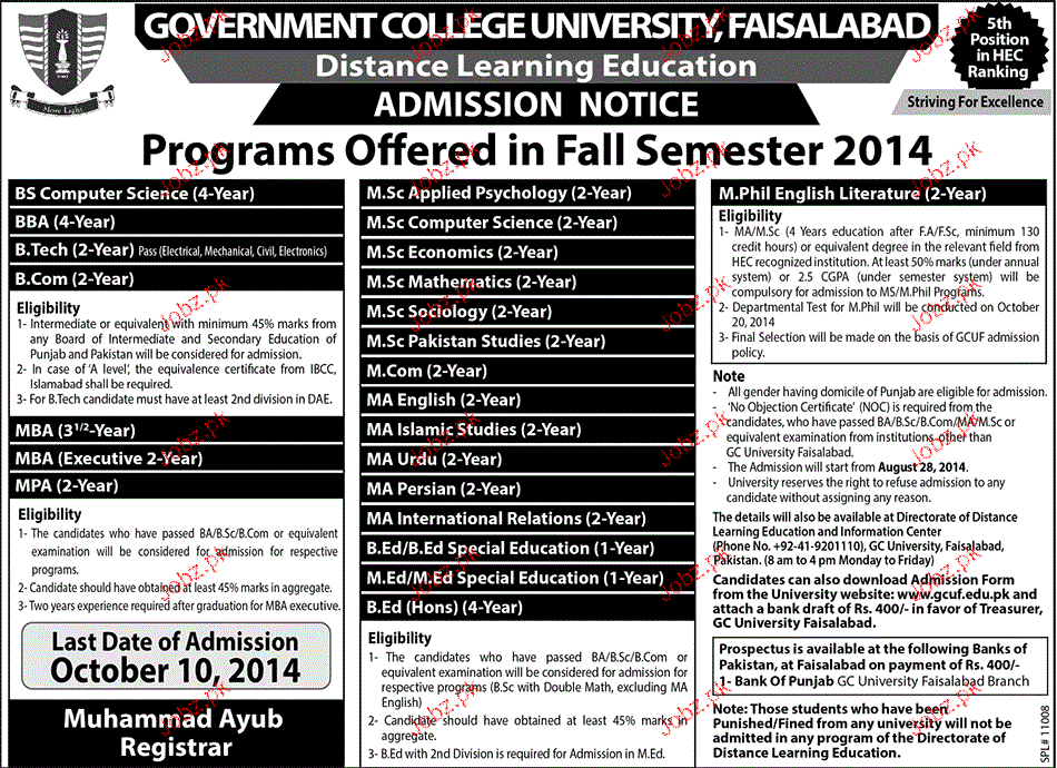 Government College University Faisalabad Admission in BS, BBA, B.Com, MSc, MA, M.Ed and B.Ed in Faisalabad. Read newspaper ad for exact details.