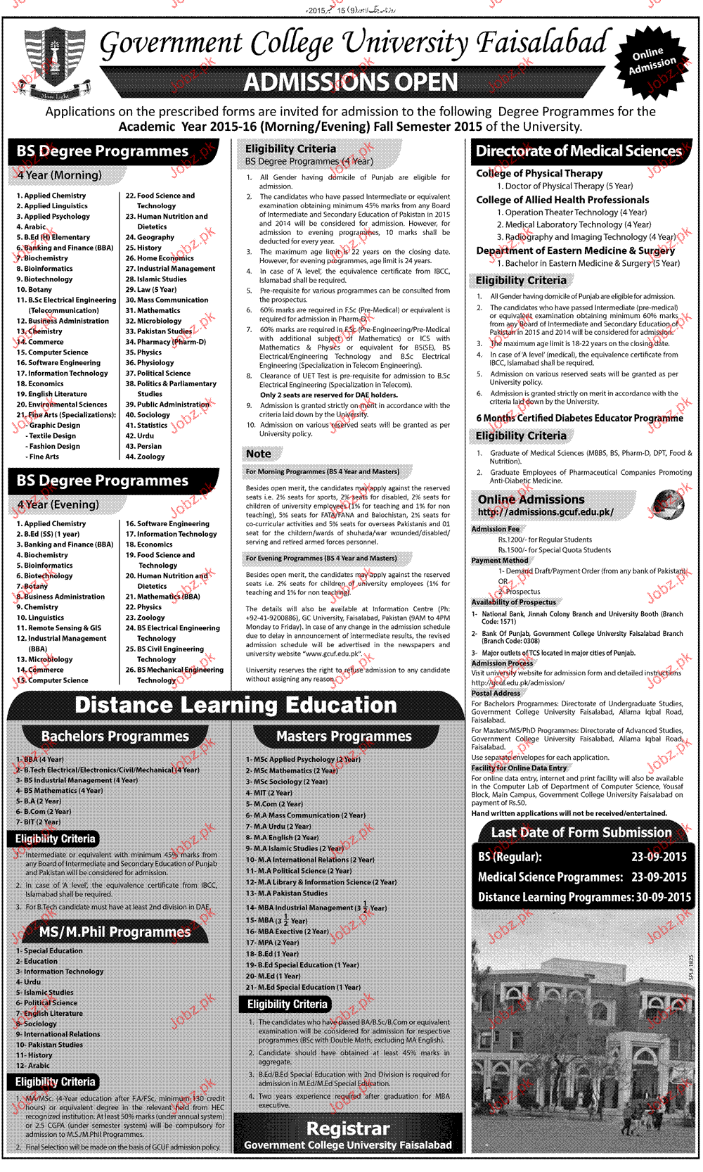 Government College University Faisalabad Admission in BS and MSc in Faisalabad. Read newspaper ad for exact details.