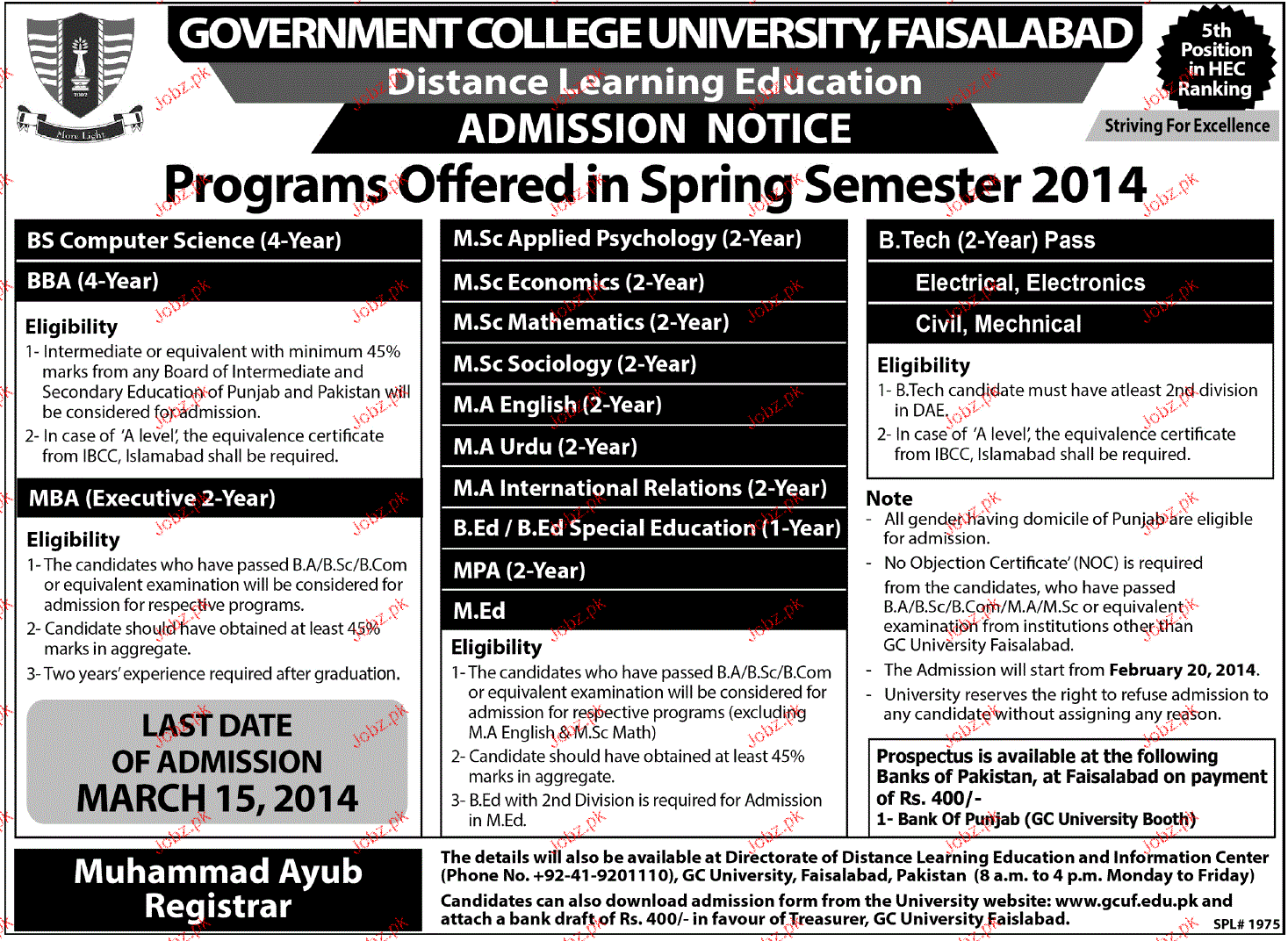 Government College University Faisalabad Admission in MSc, MA, B.Ed and BTech in Faisalabad Read newspaper ad for exact details.