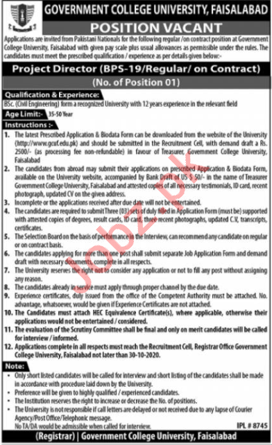 Vacancies in Government College University Faisalabad Advertisement October 2020