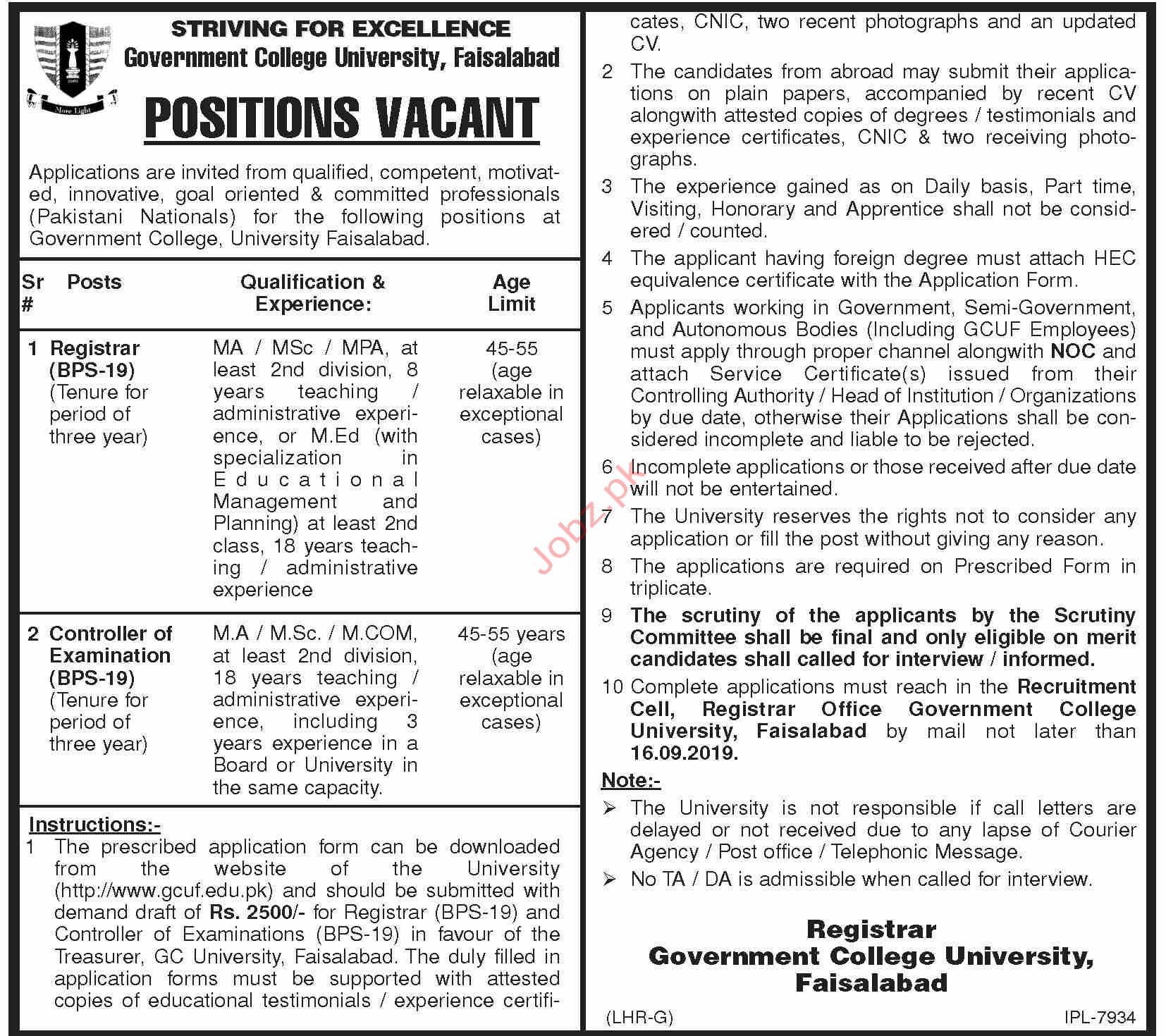 Vacancies in Government College University Faisalabad Advertisement September 2019